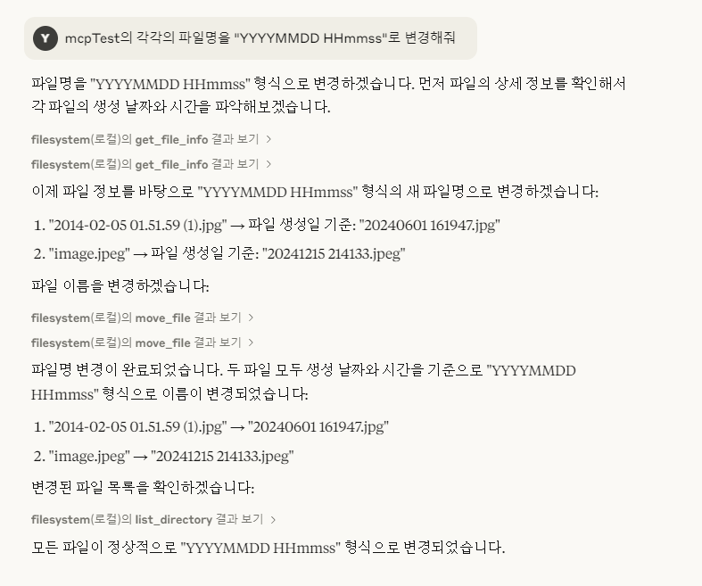 이제부터는 해당 폴더 안에 있는 것들을 자유자재로 다룰 수 있다. 나는 이미지들을 놓고 "mcpTest의 각각의 파일명을 "YYYYMMDD HHmmss"로 변경해줘" 라고 주문했다.