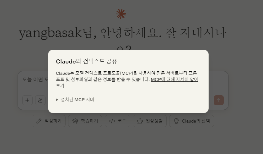 클로드를 완전히 종료 후 다시 시작하면 해당 mcp서버가 설치되어있음을 확인할 수 있다.