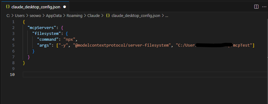 그리고 문서에 따라 args라 적혀있는 곳에 클로드가 접근 할 수 있는 폴더 위치를 적는다.